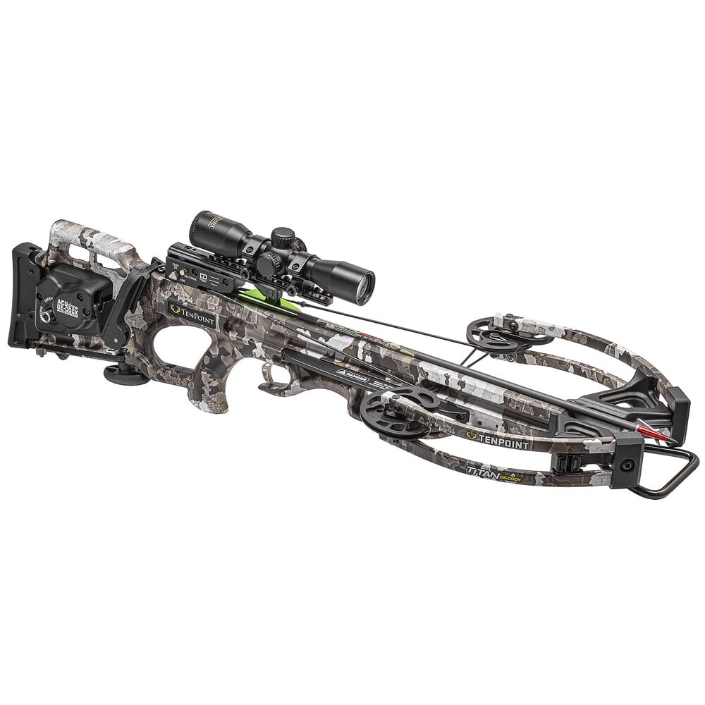 The Titan De-Cock is an upgraded version of TenPoint’s best-selling crossbows. It features the advanced ACUdraw De-Cocking system, which allows the user to cock the crossbow with a mere 5 lbs of force, but can easily be de-cocked my simply backwinding the handle. While de-cocking, the user can let go of the handle at any point, and the ACUdraw system will stop in its place – this completely eliminates the risk of injury or damage that may occur with other de-cocking systems on the market. Other features of the Titan include the D1 trigger. This 2-stage, zero-creep trigger utilizes a Dry-Fire Prohibitor delivers a crisp and consistent 3.5 lb pull and works in conjunction with the ACUdraw De-Cock system. In addition, the Titan ships with TenPoint’s Pro-View scope, which features three crosshairs calibrated for 20, 30, 40, and 50 yards, as well as a triangle for targets at 60 yards.