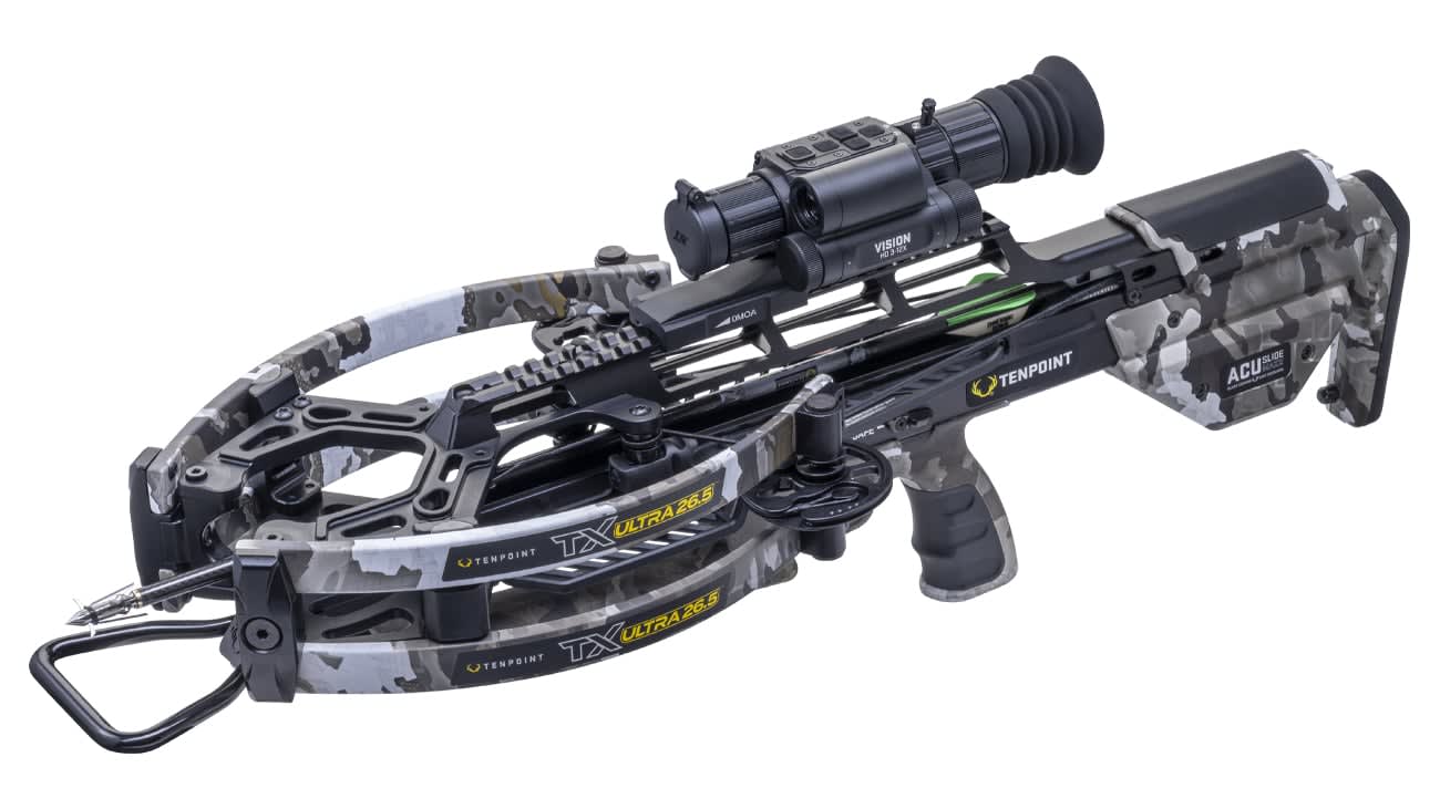 The TenPoint TX Ultra 26.5 Vision Crossbow is a flagship precision crossbow package that represents the absolute pinnacle of TenPoint's engineering and innovation, delivering an unmatched combination of speed, accuracy, and advanced technology for the serious crossbow hunter. Built around TenPoint's revolutionary ACUslide silent cocking and safe de-cocking system, this crossbow eliminates the noise and effort of traditional cocking methods while providing an exceptionally smooth and consistent draw cycle. The included Vision Rangefinding Scope integrates laser rangefinding technology directly into the optic, allowing hunters to instantly acquire precise distance data and corresponding holdover points without ever taking their eye off the target. A complete, ready-to-hunt package that sets the standard for what a modern crossbow can be.