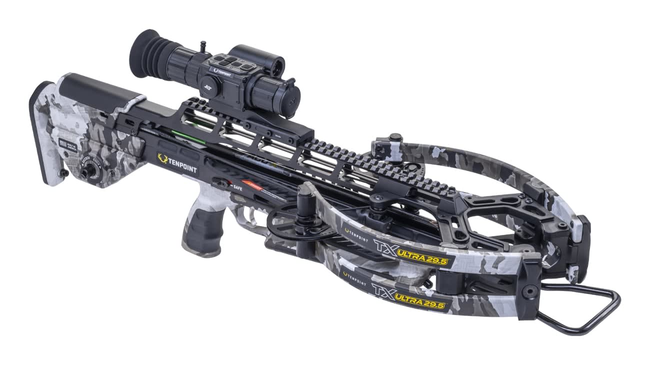 The TenPoint TX Ultra 29.5 Vision Crossbow is a premium precision crossbow package engineered for hunters who demand maximum downrange performance and cutting-edge technology in a complete, ready-to-hunt configuration. Built around TenPoint's revolutionary ACUslide silent cocking and safe de-cocking system, this crossbow delivers a smooth, consistent draw cycle while eliminating the noise associated with traditional cocking methods — a critical advantage in the field. The included Vision Rangefinding Scope puts instant, precise distance data and corresponding holdover points directly in the shooter's sight picture, streamlining the shot process for faster, more confident engagements at any range. The extended 29.5-inch platform and MAXX Vektra cam system combine to deliver exceptional arrow speeds and outstanding downrange energy for ethical, effective performance on any North American big game species.