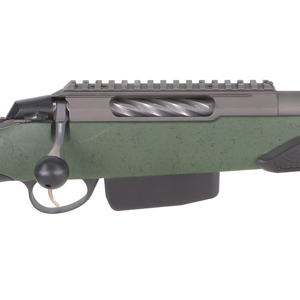 The heavy varmint profile barrel of the T3x Super Varmint is threaded with 5/8x24” threading, making it easy to install a muzzle device. The bolt assembly of the rifle features spiral fluting, which reduces weight and enhances reliability. The oversized bolt handle makes manipulating the action easy, even when wearing gloves.